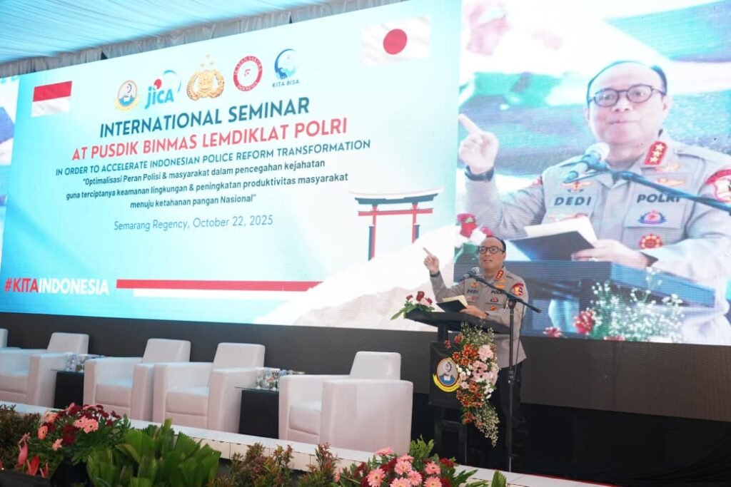 SEMARANG – Pusat Pendidikan (Pusdik) Binmas Lemdiklat Polri menggelar Seminar Internasional bertema “Optimalisasi Peran Polisi dan Masyarakat dalam Pencegahan Kejahatan Guna Terciptanya Keamanan Lingkungan dan Peningkatan Produktivitas Masyarakat Menuju Ketahanan Pangan Nasional”, pada Rabu (22/10/2025).